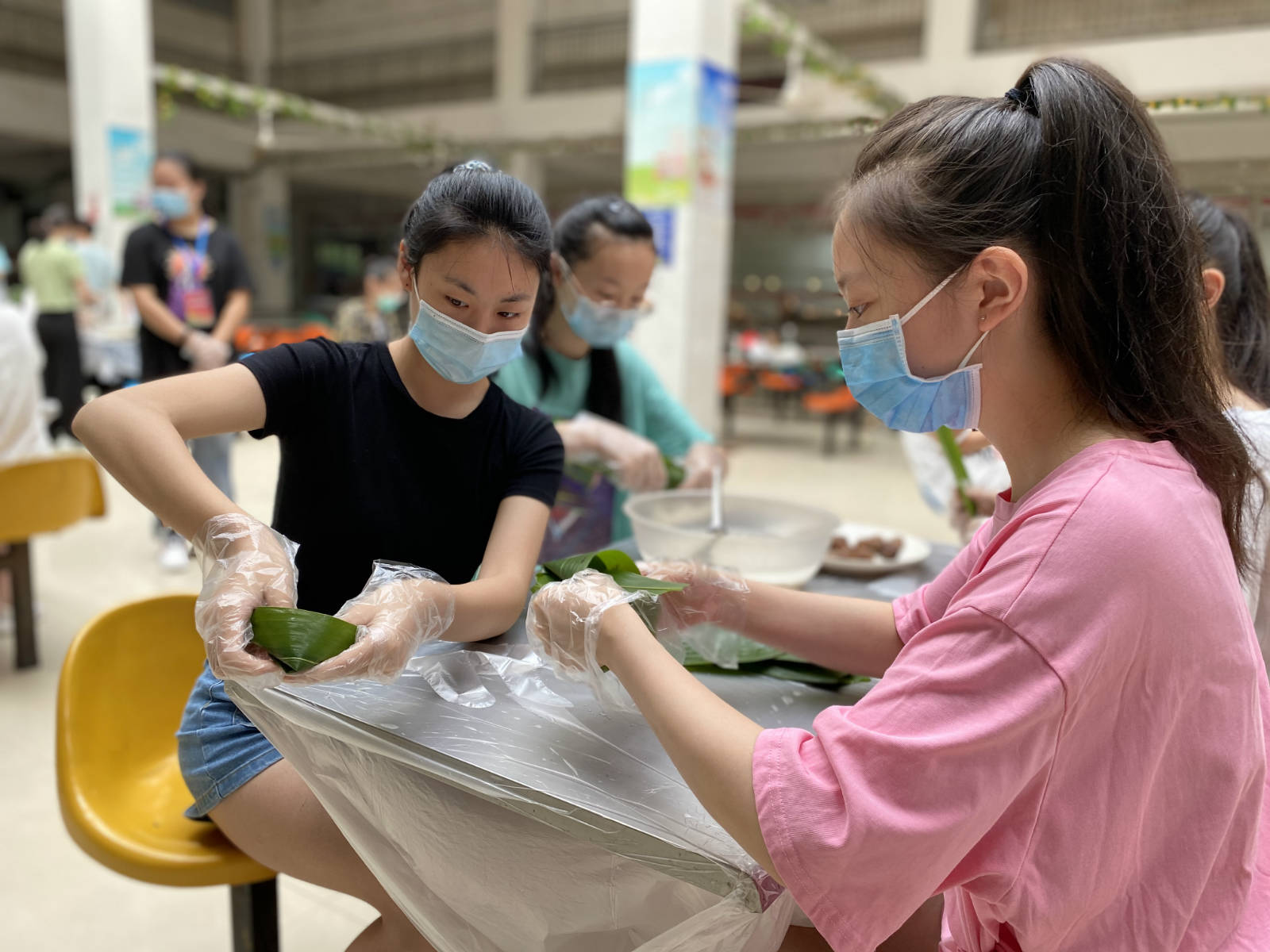 本次活动以班级为单位,以“包粽子、品粽子、送粽子、话端午”的形式展开,主持人一声令下,活动正式开始,各班级学生在辅导员的带领下开始包粽子。活动结束后由辅导员带领各班学生将煮好的粽子送给疫情期间仍坚守岗位的在校教职工。本次活动特别注意卫生防护工作,限定了活动规模和人数,采取了分批进行的模式,安排学生错峰入场,入场前排队洗手量体温,操作过程中全程佩戴口罩和一次性手套,让学生们玩得开心,吃得放心。