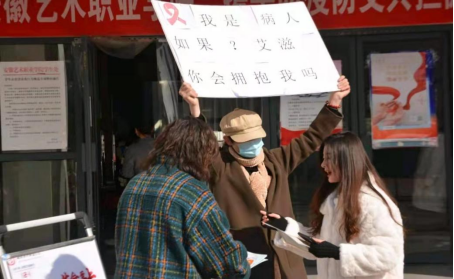 活动现场通过横幅、展板、宣传单页、广播科普等多种形式,宣传普及防控艾滋病相关知识,让同学们深刻地了解艾滋病的发病原因、症状等。