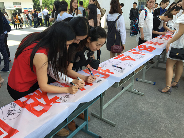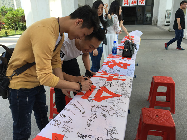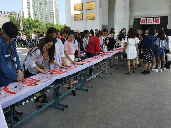 2016年5月11日上午,由院学生处、院团委组织的“感恩母校 服务社会 报效祖国 成人成才”―― 2016届毕业生文明离校签名活动在丹霞路校区隆重举行,广大毕业生踊跃地在宣传横幅上留下了自己的签名,给自己的毕业画上了一个完美的句号。不仅如此,也有我院老师也加入到此次活动中来,意在表达对毕业生美好的祝福。