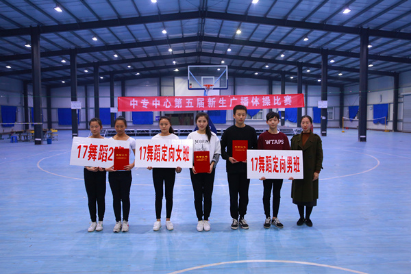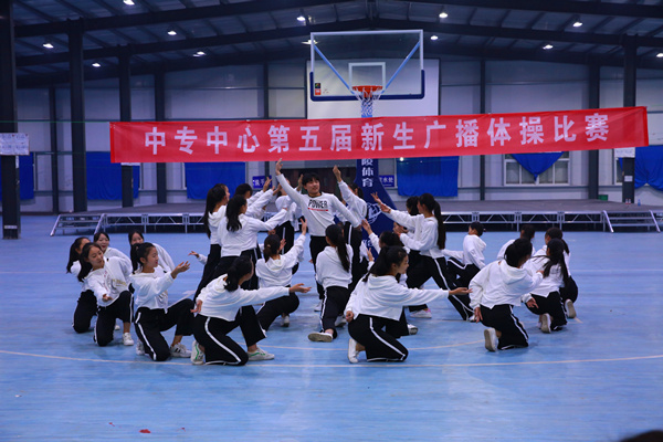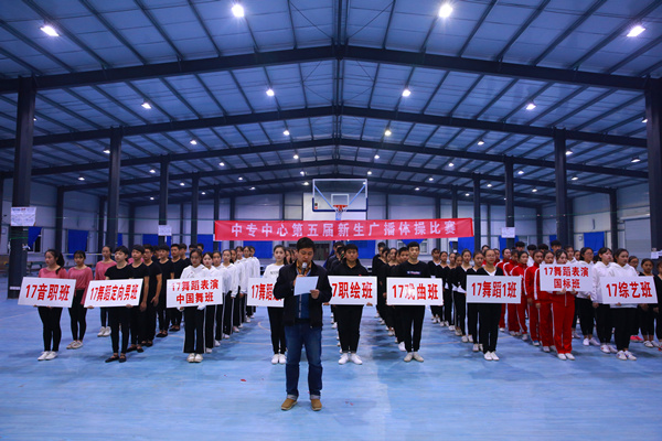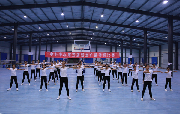 我院中专学生管理中心11月15日晚在丹霞路校区室内活动中心举行了第五届新生广播体操比赛,学院学生处副处长、中专中心主任卞振武,副主任田琦,团总支书记赵珍,各团总支委员,新生班主任及2017的全体新生参加了本次活动。