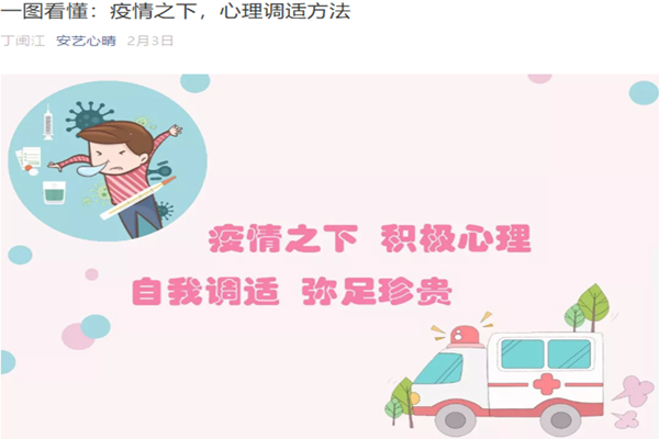 心理健康教育中心老师运用多渠道、多形式、多手段加强寒假期间及春季开学初的宣传教育,将疫情心理防护知识作为重要内容纳入开学第一课。鉴于突发事件的性质,又时处寒假和春节,心理健康教育中心借助微信公众号——安艺心晴开展宣传教育,引导学生遵守疫情防控要求,养成健康生活方式,合理安排休闲与学习活动,学会自我调节与放松,以良好的身心状态应对疫情。
