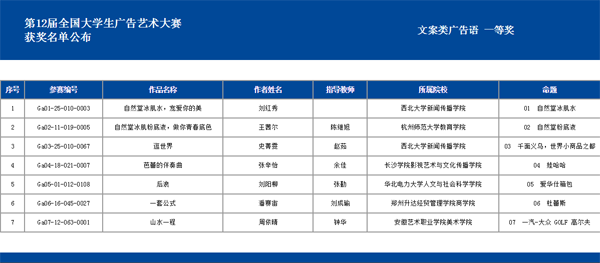我院学生荣获第十二届全国大学生广告艺术大赛 (国赛)一等奖 来源: 发布时间:2020-09-16 15:41:01 浏览次数: 我院美术学院环境艺术设计专业18空间设计工作室学生周依晴的文案类广告语作品《一汽-大众 GOLF 高尔夫》在第十二届全国大学生广告艺术大赛(国赛)中,喜获全国一等奖(指导老师:钟华)。 全国大学生广告艺术大赛(大广赛)是由教育部高等教育司指导、教育部高等学校新闻传播学类专业教学指导委员会、中国高等教育学会广告教育专业委员会共同主办,中国传媒大学、全国大学生广告艺术大赛组委会承办的全国高校文科大赛,是迄今为止全国规模最大、覆盖高等院校较广、参与师生人数最多的国家级大学生赛事。 我院美术学院学生在本届大广赛除国赛喜获一等奖1名外,省赛还获得二等级2名,三等奖4名,这也反映出美术学院近几年工作室教学取得的优异成绩,体现了美术学院倡导的“专业平台教学+项目教学+跨界教学”的专业育人优势,更充分展示出美术学院学生扎实的专业水平和良好的精神风貌。