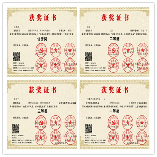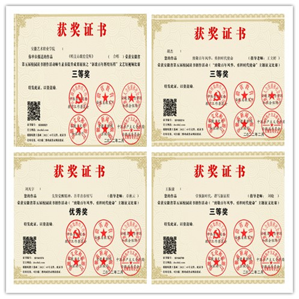我院在安徽省第五届校园读书创作活动中获奖8项 来源: 发布时间:2022-03-03 15:20:50 浏览次数: 近日,安徽省第五届校园读书创作活动获奖名单公布,我院累计获奖8项。其中,《在灿烂阳光下》获得师生素养提升成果展演之“讴歌百年辉煌历程”文艺短视频比赛一等奖,《唱支山歌给党听》获得三等奖;6名师生在“致敬百年风华,勇担时代使命”主题征文比赛中获奖,其中二等奖1项,三等奖3项,优秀奖2项。 本届活动由省委教育工委、省教育厅、省人力资源和社会保障厅、省文化和旅游厅、省新闻出版局、共青团安徽省委员会共同主办,以“读书引领人生,创作点亮梦想”为宗旨,以“致敬百年风华,勇担时代使命”为主题,面向全体师生征集读书创作征文作品、师生素养提升展演文艺短视频、“书写百年美好画卷”书法和绘画作品等,鼓励广大师生结合多种创作手段,在作品中表达所见所闻所思所感,抒发爱党爱国爱社会主义情怀。 我院高度重视本次读书创作活动,学生处根据活动要求,印发了院级读书创作活动方案。此项活动于2021年7月启动,紧紧围绕活动主题,结合“庆祝中国共产党成立100周年”主题宣传活动及党史学习教育,积极创造条件,培育富有特色的读书活动品牌,引导广大师生坚定不移听党话、跟党走,厚植爱党爱国爱社会主义的朴素情感,让红色基因、革命薪火代代相传。