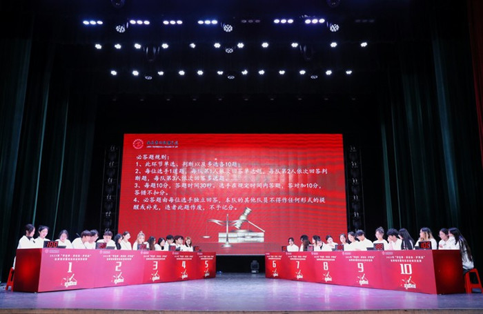决赛现场,各代表队在激烈的角逐中展现出了扎实的法律知识和良好的团队协作。竞赛内容包括宪法、民法典、刑法等法律法规,综合考察了参赛团队的法治意识和法治素养。比赛设置了必答题、抢答题和风险题等多个环节,充分考验了选手们的法律知识和应变能力。