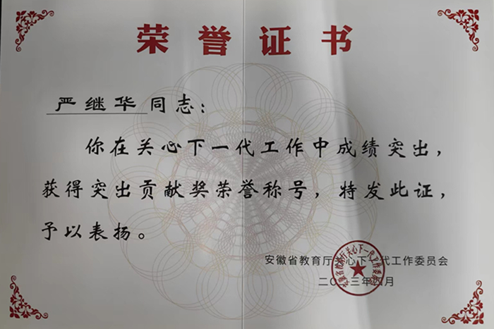 严继华同志自2007年起从事关工委工作、2017年起担任院关工委常务副主任以来,在院党委的领导下,积极开展工作,推动关工委自身队伍和机制建设,把热心关工委工作、有一定特长、身体健康、刚从工作岗位上退下来的同志,补充到关工委队伍中来,促进关工委成员年轻化,工作开展常态化。为了让广大“五老”跟上时代的步伐,适应新时代关工委工作的要求,他积极组织关工委成员学习习近平总书记关于关工委工作的一系列重要指示精神,学习中央、省委、教育部以及安徽省委教育工委关于加强关工委工作的一系列重要文件精神,让广大“五老”政治上和党中央保持一致,拥护“两个确立”,做到“两个维护”,增强“四个意识”,坚定“四个自信”,为培养中国特色社会主义事业的建设者和接班人奉献力量。他积极创新关工委工作形式,如开展“知名校友回母校”活动;鼓励“五老”给大学生上时事政治课,帮助大学生正确认识国内和国际形势;安排“五老”给新生做校史报告,增强青年学生对学校的情感认同。通过不懈努力,为开创学院关工委工作的新局面做出了突出的贡献。
