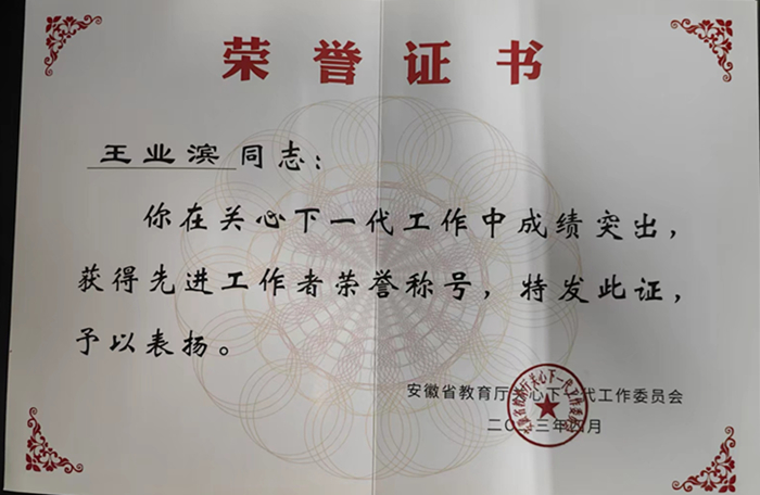 为纪念安徽省教育厅关心下一代工作委员会成立三十周年,近日,省教育厅关工委表彰了一批全省教育系统关工委先进集体和先进个人。我院关工委常务副主任严继华、关工委委员王业滨分别获得“关心下一代突出贡献奖”“关心下一代先进工作者”光荣称号。