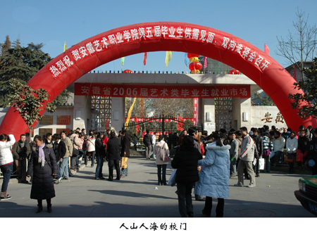 由我院承办的安徽省2006届艺术类毕业生就业市场暨永利欢乐娱人城2006届毕业生供需见面双向选择会于2005年12月14――16日顺利举办了。三天时间里来自全国各地近百家用人单位齐聚安艺,他们当中有浙江、湖南、湖北、安徽、福建、上海、南通、苏州、南京、杭州等二十多家省、市级专业文艺团体,有中国人民解放军南京军区前线文工团、炮兵学院、电子工程学院等六家部队文艺团体,有重庆长安汽车集团、深圳华侨城欢乐谷艺术团等知名国有企业,由珠海汉胜,杭州宋城等实力雄厚的民营企业,他们兴致勃勃地观看了我院安排的十余场毕业生的专业展示.16日下午在我院的文体广场,彩旗招展,一条条包含用人单位亲密友情的横幅和91家用人单位的招聘展位遥相呼应,一个热闹非凡的场面驱散了冬的寒意,迎来了春天的温馨。