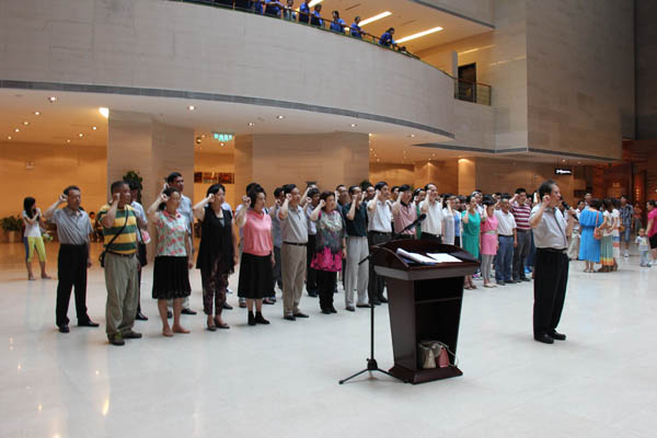 6月26日下午,学院庆祝建党92周年新党员入党宣誓仪式在合肥滨湖新区渡江战役纪念馆隆重举行,学院党委领导班子全体成员、省文化厅机关党委专职副书记王爱华及各总支、各支部书记、各部门主要负责同志、近两年新入党教职工党员、学生党员共约六十人参加了宣誓仪式,仪式由学院纪委书记冯新平主持。