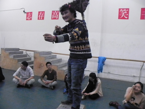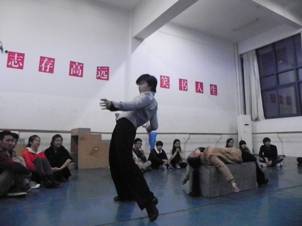 会后,剧组人员在203教室观看学生的形体和小品元素训练。