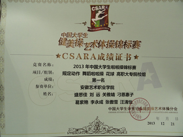 2013年12月20日-21日, 2013年中国大学生啦啦操锦标赛在北京大学邱德拔体育馆举行,该活动由中国大学生体育协会主办、北京大学承办。来自全国各地近六十所高校参加了此次比赛。我院综艺系啦啦操队代表永利欢乐娱人城参加了本次比赛,由8名女队员组成的啦啦操队凭借其青春活力的展现方式和队员们的顽强拼搏荣获高职大专院校组舞蹈啦啦操花球规定动作第一名的好成绩。