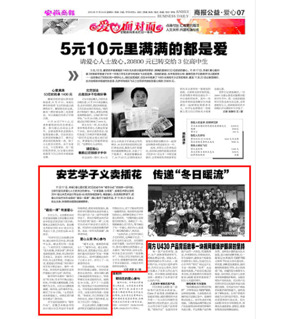 2012年9月,我院成功申报的“文化部科技创新项目――大学生创业孵化基地”自建立以来,在视觉艺术、影音工厂、特色社团等项目上积极探索,学生参与、导师指导,取得了一定的成绩。2013年11月24日,省内知名媒体《安徽商报》专门报道了安艺创艺园――任何空间举办的创意集市鲜花义卖活动。我们的创意集市,鲜花义卖都是学生们自己准备的作品,既锻炼提高了他们的业务能力,也通过这种公益形式提升了他们的思想境界,在校园,在社会传递我们的正能量。