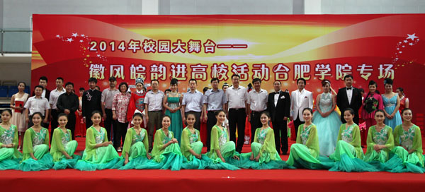 7月1日上午,2014校园大舞台――“徽风皖韵进高校”活动合肥学院专场文艺演出在合肥学院新区体育场拉开帷幕,省教育厅体卫艺处处长宣进,安徽省委宣传部文艺处副处长范伟军,省文化厅文艺处调研员应尼,合肥学院党委书记蔡敬民、院长张文兵,永利欢乐娱人城院长、安徽大学艺术与传媒学院常务副院长张云,永利欢乐娱人城副院长、安徽大学艺术与传媒学院副院长王红等领导嘉宾出席观看了演出。