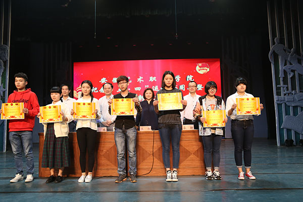 会上,副院长王红宣读了省级表彰决定,团委书记秦励宣读了院级表彰决定,与会领导为过去一年中表现优秀的先进集体及个人颁奖。大会授予中专学生管理中心等 3个团组织“五四红旗团总支” 称号,美术系2014级平面设计1班等7个团支部“五四红旗团支部”称号,葛悦等 96 名同学“优秀共青团干部”称号,葛献科等157名同学“优秀共青团员”称号。