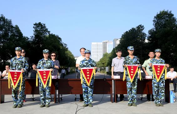 分列式汇报表演结束后,王红副院长宣读了表彰2015级新生军训先进集体和个人的决定,出席大会的各位领导为受到表彰的4个“军训先进连队”、11个“军训文明宿舍”和49名“优秀学员”代表颁发了奖状和荣誉证书。接着,王瑞书记向军训承训部队赠送了锦旗,表达全院师生对承训部队官兵的深情厚谊。