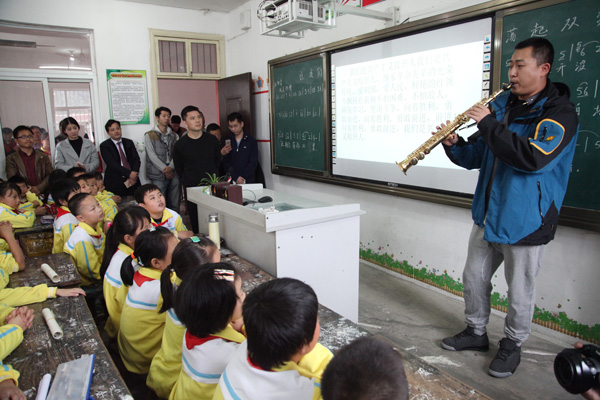 面对可爱的孩子们,音乐系副主任李小舒,音乐系教师吕丽娜、程伟乐,艺术实践中心王琰老师和赵普先生一起共同完成了一堂精心准备、精彩而生动的艺术素质提高课,孩子们不但在手风琴伴奏中学习了歌曲《让我们荡起双桨》、《我们是共产主义接班人》,还欣赏了萨克斯名曲《回家》等,在欢声笑语中这些平时很难接受到专业艺术教育的孩子们收益颇丰,享受到了艺术教育带给自己的无限美好,在场的媒体和观众也为这精彩的艺术课程报以热烈掌声。
