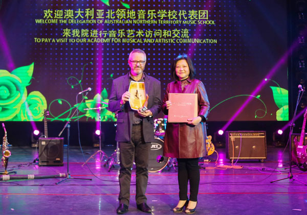 25日下午,中澳双方师生文化交流演出在舞蹈楼剧场举行。演出开始前,王红副院长和澳方代表互赠了纪念礼物。