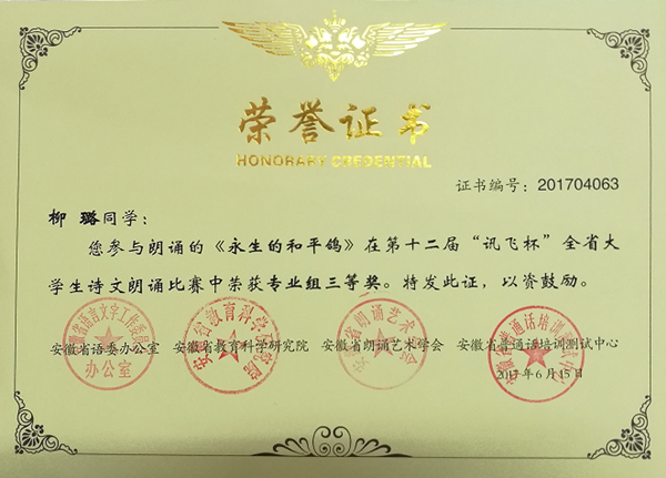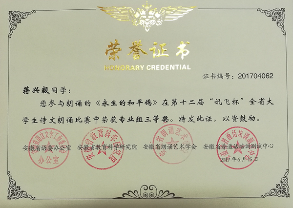 近日,由安徽省语委办、安徽省教科院、安徽省朗诵艺术学会、安徽省普通话培训测试中心主办的第十二届“讯飞杯”全省大学生诗文朗诵比赛决赛在安徽大学磬苑校区举行。赛前,通过我院学生处团委主办的 “永利欢乐娱人城第二届大学生诗文朗诵比赛”进行校内初选,根据比赛角逐的结果分别推报了非专业组戏曲系《脸谱生涯》,专业组戏剧系《永生的和平鸽》、综艺系《春》共三个参赛作品参加全省比赛。