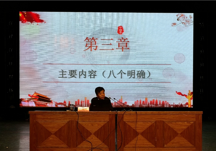 典礼结束,纪委书记姚成秀开讲本期业余党校第一课《不忘初心,牢记使命——习近平新时代中国特色社会主义思想解读》。