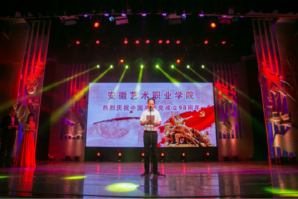 演出开始之前,王瑞发表致辞。他表示中国共产党建党98年,是栉风沐雨的九十八年,是砥砺奋进的九十八年,是一路高歌的九十八年。学院在党的科教兴国战略方针指引下,围绕立德树人根本任务、以全面从严治党为抓手,强基固本夯实党建基础,抓改革、促发展、强党建、重管理、保民生,保持了学院的稳定和发展。未来,学院广大党员和干部教师将不忘初心、牢记使命,在学院党委的坚强领导下,以更加昂扬的斗志、更加扎实的工作和更加优异的成绩向党的九十八周年献礼,以昂扬的精神状态迎接新中国70周年华诞。