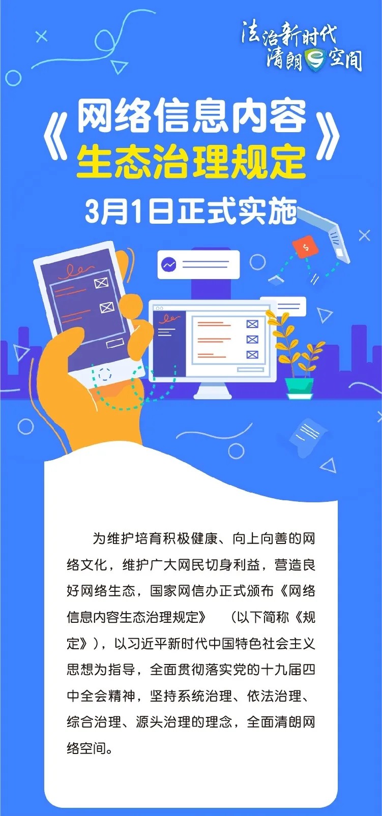 《网络信息内容生态治理规定》已经国家互联网信息办公室室务会议审议通过,现予公布,自2020年3月1日起施行。