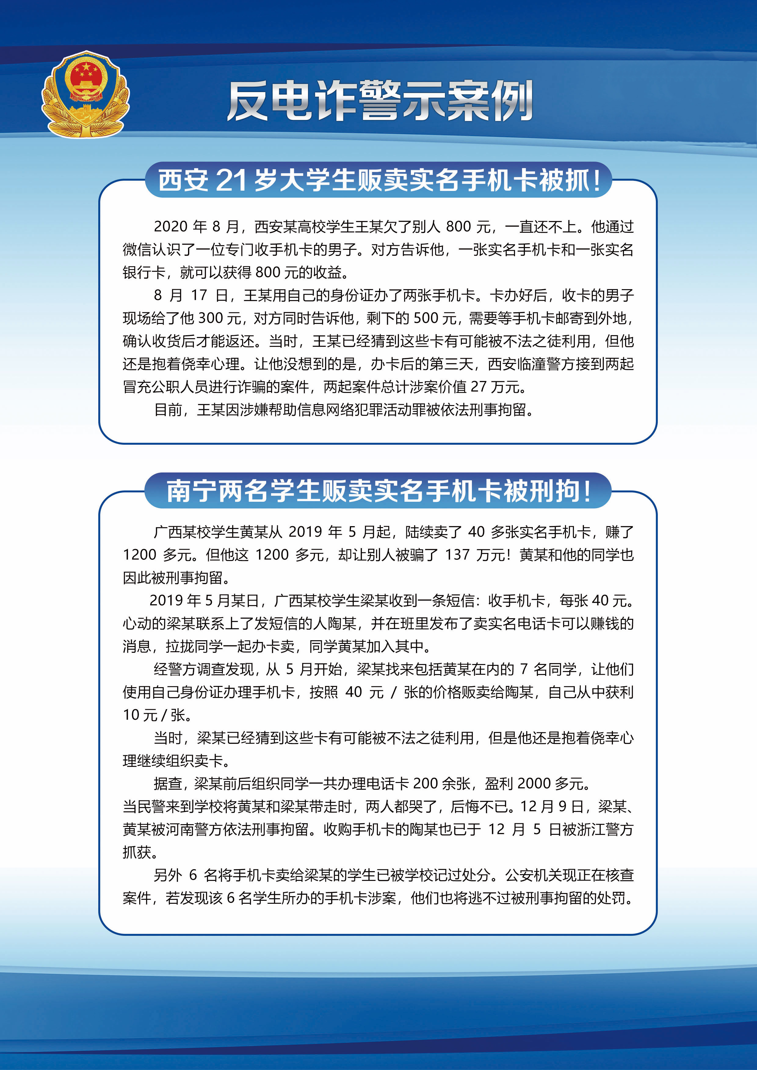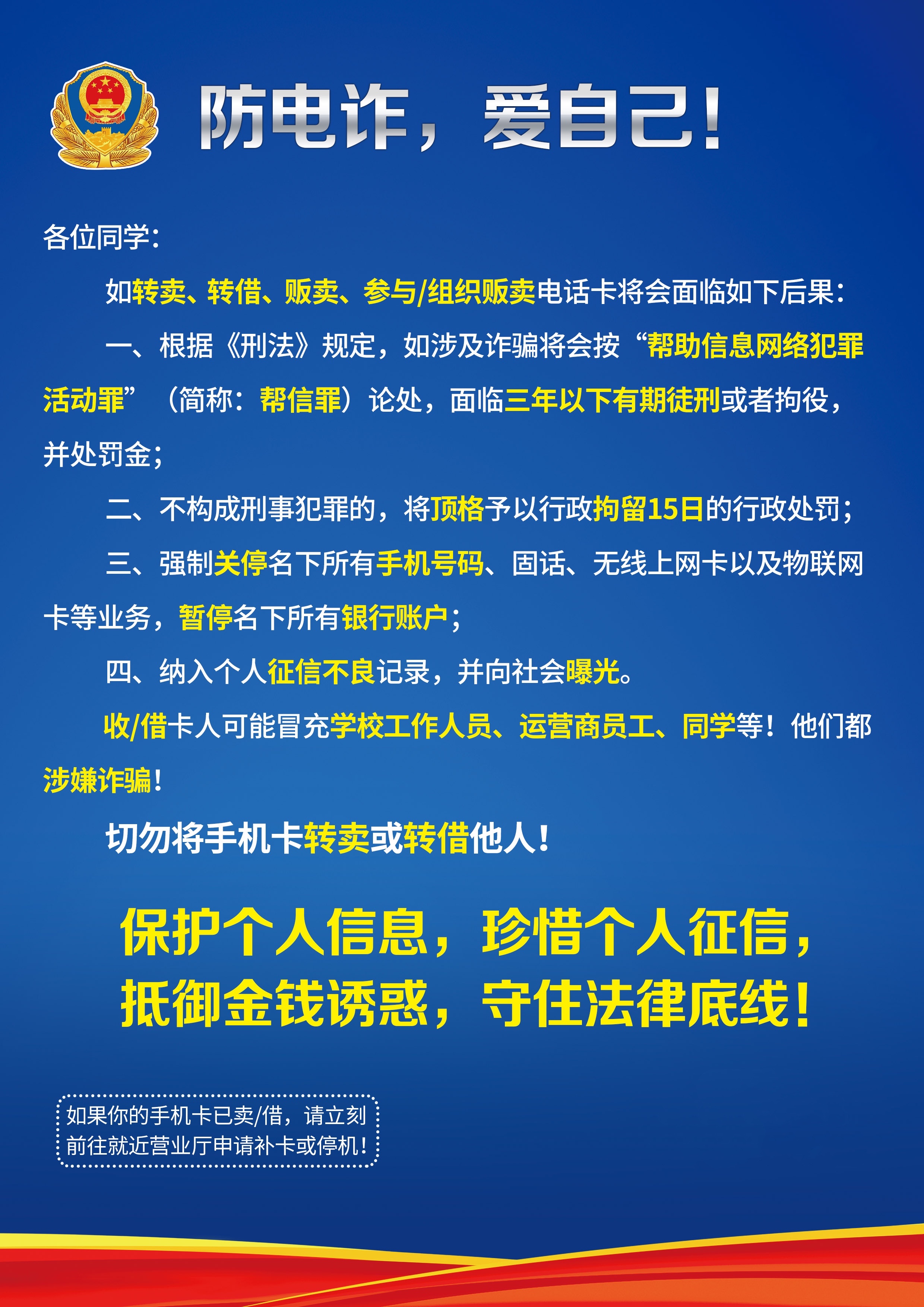 各位同学务必珍爱个人信息,珍惜美好前途,抵御金钱诱惑,守住法律底线!如所办理手机卡已被他人回收,请立刻携带身份证前往就近通讯运营商营业厅处理。