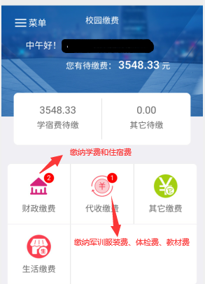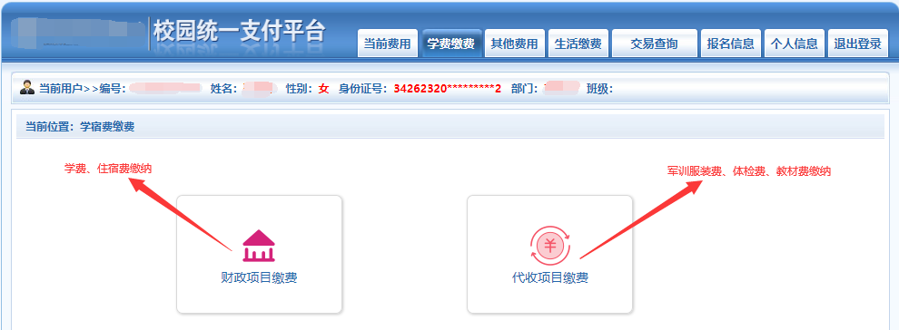 学费和住宿费缴费,请点击财政项目缴费;军训服装费、体检费、教材费请点击代收项目缴费。选择相应的缴费进入下图