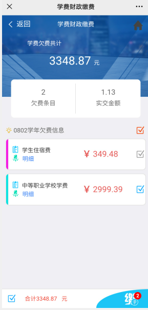 点击导航栏的“学费缴费”按钮,显示学费欠费和选择页面,如下图所示: