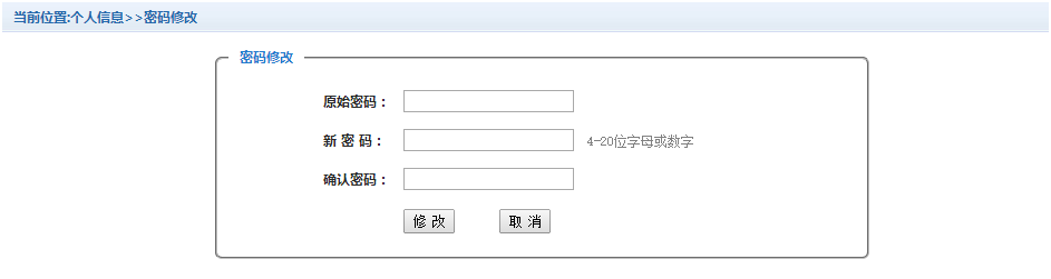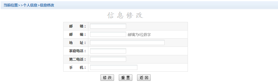 点击个人信息界面的个人信息修改,显示下图所示的个人信息维护界面。在相应的输入框,输入需要修改的个人信息,点击“修改按钮”完成个人信息维护。未保存前,点击“重置”按钮,还原个人信息。