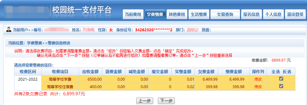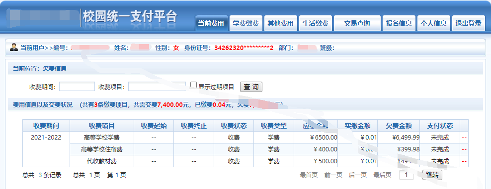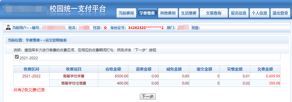进入学生缴费界面,显示当前人员的所有欠费。如下图
