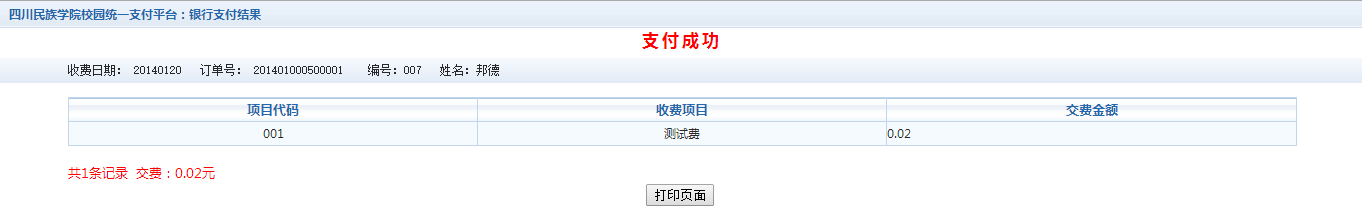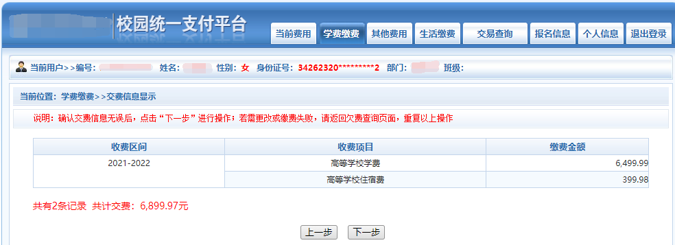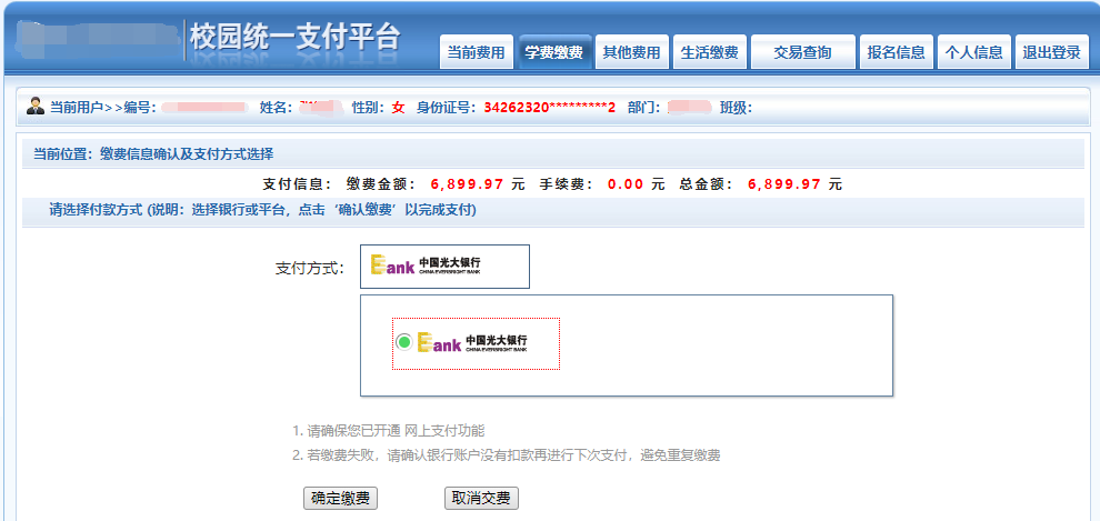 2. 银行交易完成后,如缴费失败,请到网上银行查询银行卡是否已扣款,如已扣款切勿重复缴费,学校会在1-2个工作日恢复次交易