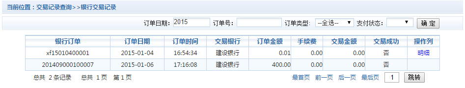 点击导航栏的“交易记录查询”按钮,可以查询具体的银行交易记录。如下图所示。