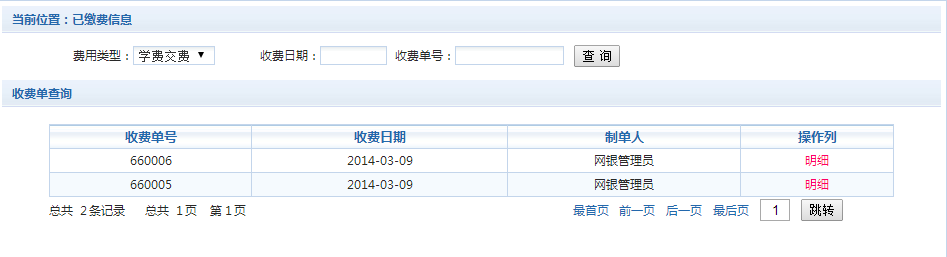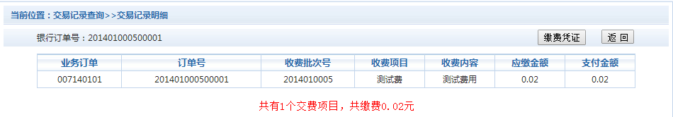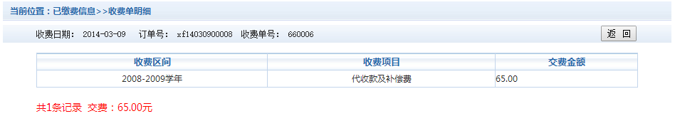 点击记录栏的“明细”连接,可以查询具体的缴费项目信息。如图3.6-2所示