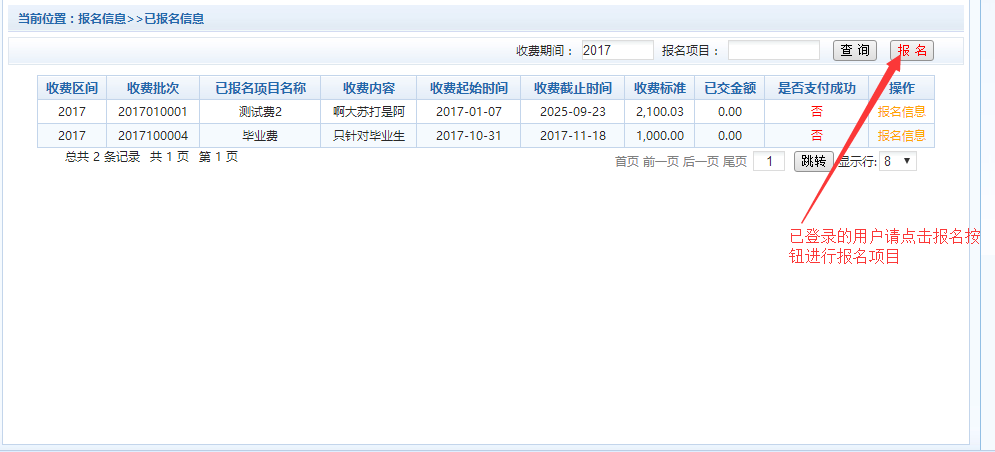 已注册用户(包括在校生、其他使用过平台缴费的人员)可以登录支付平台,点击导航栏“报名信息”界面,选择报名项目,点击“报名”按钮进行报名。如下图所示