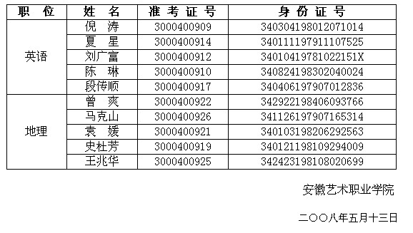 2008年公开招聘英语、地理岗位入围名单 来源: 发布时间:2008-05-13 00:00:00 浏览次数: 根据《2008年省直事业单位新进人员招聘工作实施方案》(皖人发[2008]14号)精神,依据省人事考试院统一组织的《职业能力测试》和《公共基础知识》两科笔试总成绩从高分到低分顺序,按照1:5比例确定各招聘岗位参加专业测试的人员名单。 现将英语、地理岗位入围名单公布如下: