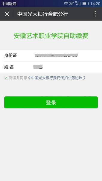 关注学院公众号“永利欢乐娱人城(artahcn)”,点击下方学生缴费,正确输入身份证号和姓名,点击登录。