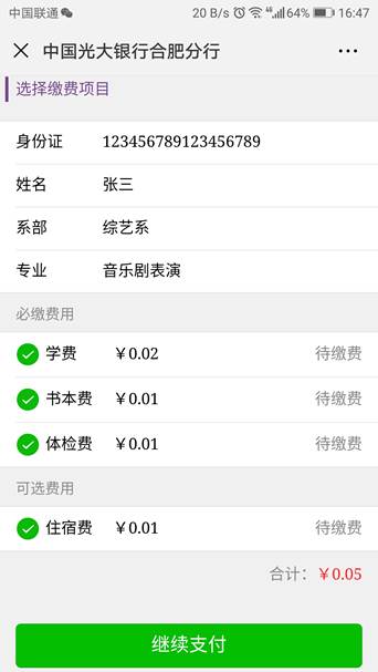 选择缴费项目,点击【继续支付】。其中不住校学生可以免交住宿费,但应在报到日至学生处办理外住手续,并将相关表格交至财务处。