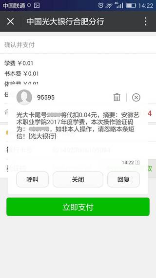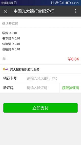 学生确认缴费费用与金额无误后,输入银行卡号,点击【获取验证码】,短信验证码将会发送到银行卡预留手机上。