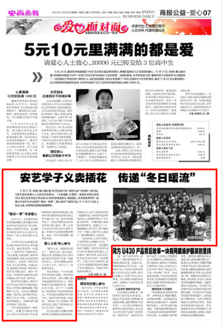 2012年9月,我院成功申报的“文化部科技创新项目――大学生创业孵化基地”自建立以来,在视觉艺术、影音工厂、特色社团等项目上积极探索,学生参与、导师指导,取得了一定的成绩。2013年11月24日,省内知名媒体《安徽商报》专门报道了安艺创艺园――任何空间举办的创意集市鲜花义卖活动。我们的创意集市,鲜花义卖都是学生们自己准备的作品,既锻炼提高了他们的业务能力,也通过这种公益形式提升了他们的思想境界,在校园,在社会传递我们的正能量。