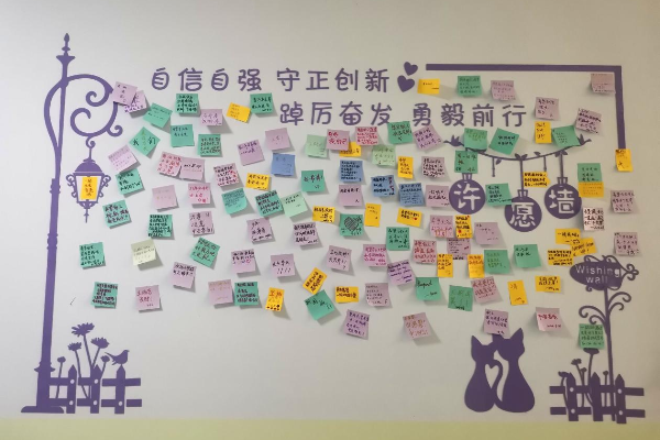同学们热情参与“许愿墙”活动,纷纷在便签纸上写下自己对学业和人生规划方面的寄语,以及对未来的美好期望,再认真粘贴在许愿墙上。五颜六色的贴纸装点了许愿墙,展现了安艺学子积极向上的心态。