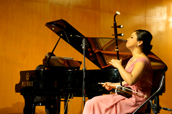 3月29日晚上7:30分,音乐系2012-2013教师技能展示系列音乐会在永利欢乐娱人城实验剧场拉开帷幕。首场展示为吴青老师二胡独奏音乐会。吴青来自于美丽的江城马鞍山,曾师从二胡教育家张仕安、于汉 ,并多次获得各种比赛奖项。音乐会以《兰花花叙事曲》开始,以《雪山魂塑》告终。赵荫河先生担任排练。本院师生担任伴奏。在春风沉醉的夜晚,现场的观(听)众共同体验和享受了一段令人难忘的二胡音乐之旅。(音乐系办公室 特约摄影:崔新国)
