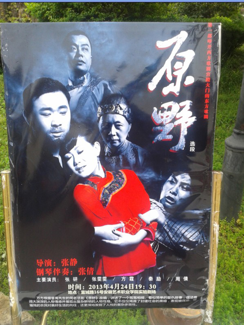 2013年4月24日晚7:30,音乐系在永利欢乐娱人城(宣城路校区)实验剧场演出四幕歌剧《原野》(改编版)。该剧由万方根据曹禺先生同名话剧改编,金湘作曲。歌剧省略了许多情节,借助音乐,重点展示了人物深层的心灵和感情,把剧情推入了更高的诗的意境。张雯雯饰演金子,张研饰演仇虎,方霞饰演焦母,秦励饰演焦大星。周倩友情出演白傻子。张静导演,张倩钢琴伴奏。(音乐系办公室)
