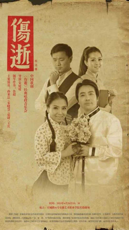 2013年4月26日晚7:30,音乐系在永利欢乐娱人城(宣城路校区)实验剧场演出歌剧《伤逝》(校园版)经典唱段。《伤逝》原著鲁迅,歌剧由人民音乐家施光南作曲,韩伟、王泉编剧,郑小瑛节编。节编版以子君的悲剧为主线,将高潮锁定在子君不得不“回去”的《不幸的人生》。孙来法饰演涓生,朱晓慧饰演子君,张研饰演男歌者,王兵饰演女歌者。宋媛媛导演,鲁超钢琴伴奏。(音乐系办公室)
