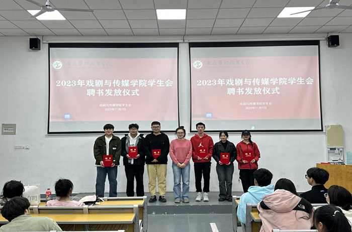 2023年11月7日,戏剧与传媒学院学生会聘书发放仪式在丹霞路校区室内活动中心阶梯教室102举办,戏剧与传媒学院团总支书记蔡瑞出席,戏剧与传媒学院学生会全体成员参加。