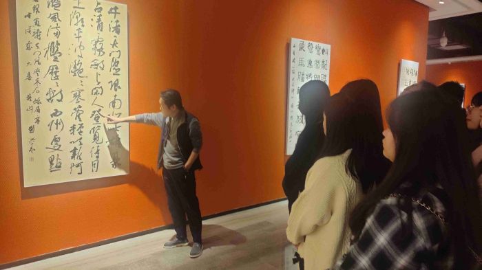 本次展览共展出刘文华先生作品近200幅,包含隶楷行草多种书体,涵盖对联、中堂、立轴、扇面、课稿等多种形式,从课徒手稿到正式作品、从摩崖碑版到文房书联,一幅幅具有丰富趣味的书法作品,全面展示了刘文华的书学体系与深厚的笔墨修养,专业课教师向学生们细细分析作品的结构、内涵、文化背景及艺术价值,让学生们在赏析中提升专业能力。