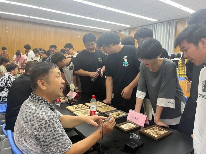 合肥市文化馆副馆长卫博森、彭静及纸笺加工技艺、火笔画、庐州吴氏船模制作技艺、庐州核雕、庐州面塑等众多非遗大师出席创作见面会。美术学院副院长胡婧主持本次见面会。