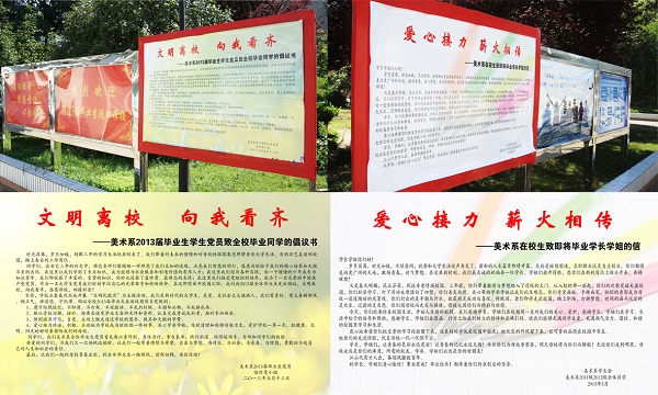为做好2013届毕业生返校、离校工作,永利欢乐娱人城美术系党总支结合学院文明礼貌月活动,组织毕业生党员成立临时党小组,倡导文明离校新风,把健康、阳光的良好形象留给母校,充分发挥党员的先进模范带头作用毕业生即将离校,相处三年的同窗就要分别了,依依不舍。美术系党总支、团总支组织学生会的同学,代表广大在校生给学长、学姐写一封情真意切的信,感谢学长、学姐曾经在生活上给予的关心和学习上给予的帮助,祝愿学长、学姐一路顺利,事业有成!