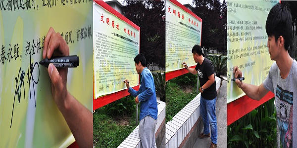 活动接近了尾声的时刻,我们请毕业生党员们在“文明离校倡议书”签名并留影,留下这一份纪念。学长学姐们,你们的笑脸仿佛也在告诉我们美好的明天。