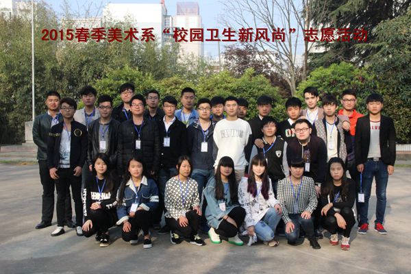 美术系学生会积极响应学院号召,组织学生开展践行社会主义核心价值观活动,在美术系团支部领导下,配合学院校园文明月主题,进一步培养学生的公共卫生意识,形成良好的校园文明新 风尚,同时充分发挥学生干部在倡导社会主义新风尚中的表率作用, 美术系在 2015 年 3 月 30日开展“校园卫生”活动,展现学院校园之美。