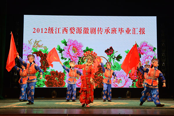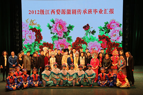2012级江西婺源徽剧传承班是永利欢乐娱人城与江西婺源县政府、婺源徽剧传习所(剧团)校企合作共建的“非遗”传承人才定向培养班,也是安徽省高校省级质量工程项目――戏曲表演专业校企合作实践基地的重要建设成果。传承班32名同学入学以来,在学院精心培育下从零基础入门开始,短短几年之间茁壮成长为可以独立担纲整台剧目演出的表演、伴奏团队,顺利完成学业,有多名同学荣获全国职业院校技能大赛和安徽、江西两省的专业赛事大奖。