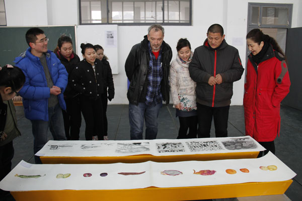 宋怡院长、外教Mark等师生参观画展,多媒体设计与制作专业老师曹光宇老师正在讲解